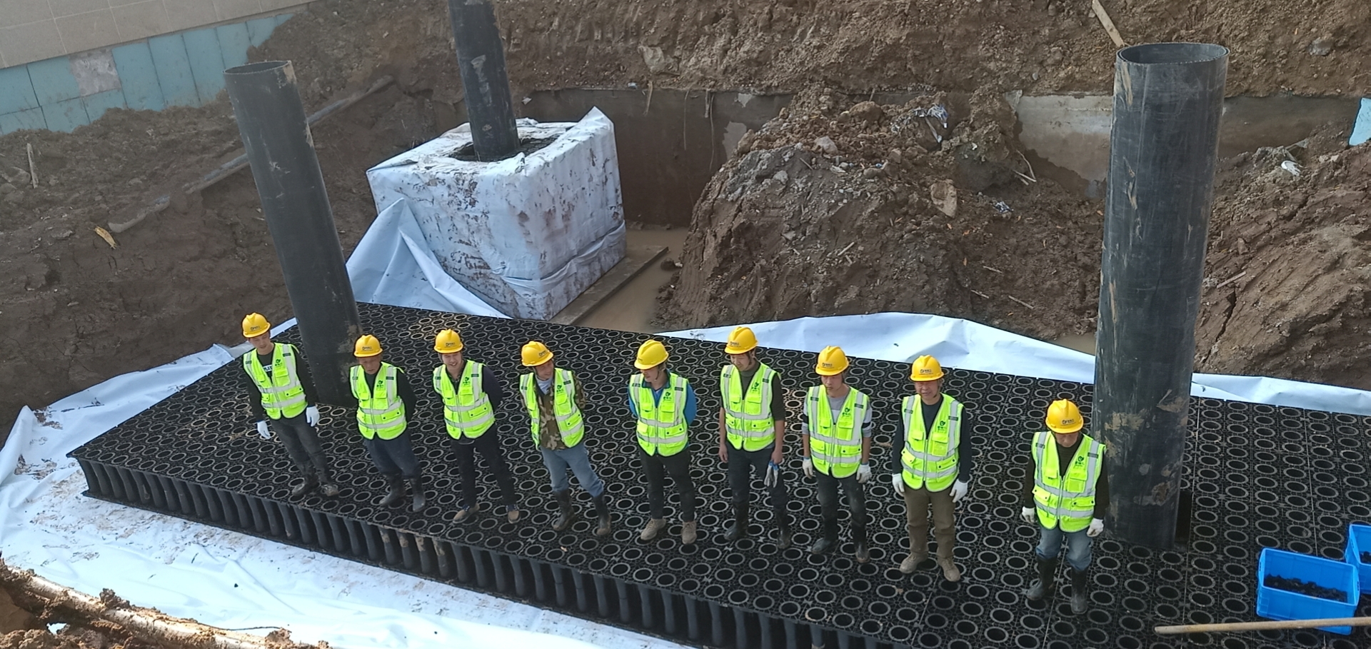 該項目雨水收集系統采用地埋PP模塊組合水池的方式收集雨水,前期經過截污掛籃、棄流過濾,后期通過地埋一體機過濾,消毒,最終使水質達到規范標準,用于廠區綠地的澆灑,景觀補水,道路沖洗等。
