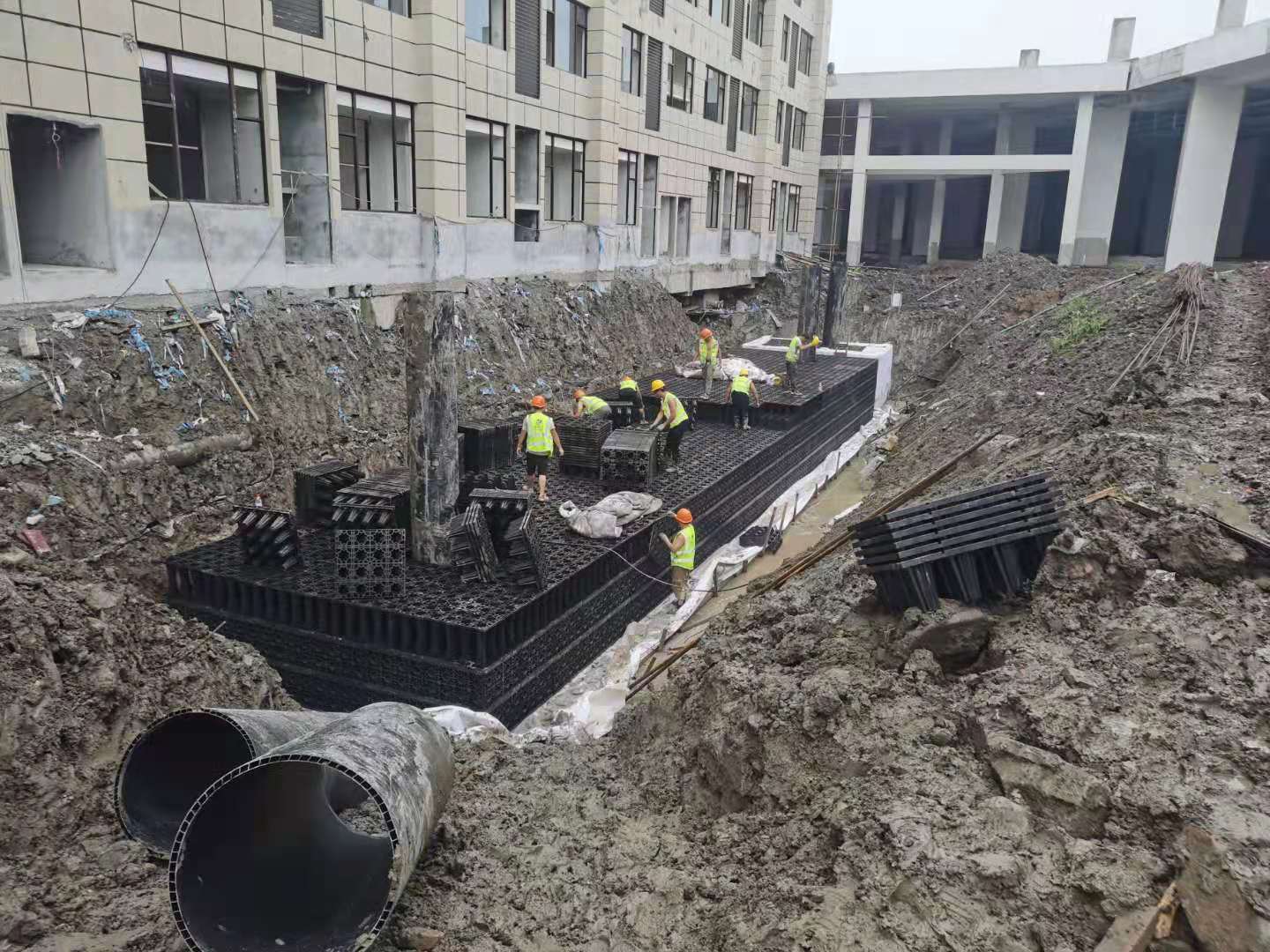 該項(xiàng)目雨水回收系統(tǒng)采用地埋PP模塊組合水池的方式收集雨水,前期經(jīng)過截污掛籃、棄流過濾,后期通過地埋一體機(jī)過濾,消毒,最終使水質(zhì)達(dá)到規(guī)范標(biāo)準(zhǔn),用于廠區(qū)綠地的澆灑,景觀補(bǔ)水,道路沖洗。